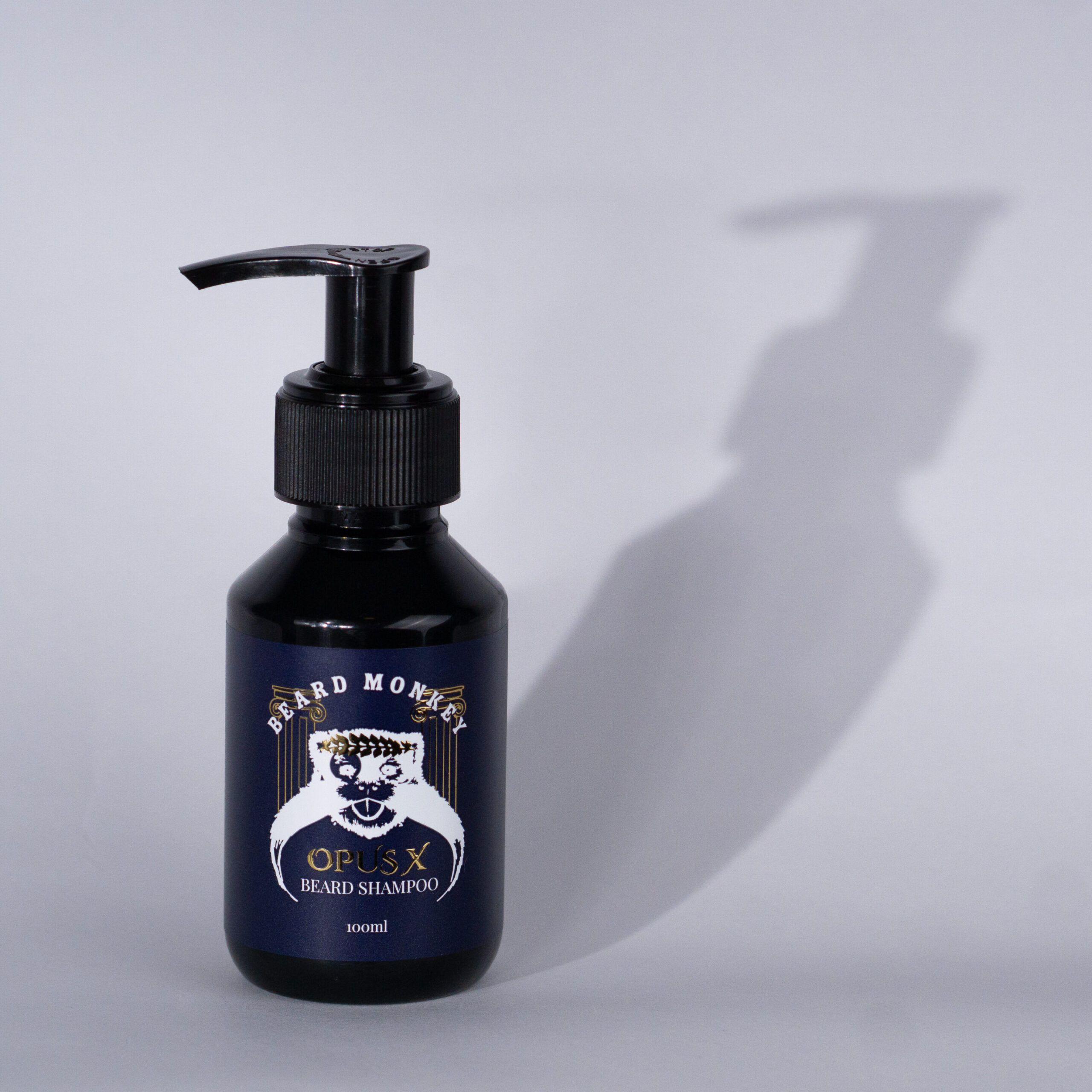 Beard Monkeys skäggschampo I doften OPUS X. En svart pumpflaska om 100ml med mörkblå etikett och vit text. Etiketten är dekorerad med Beard Monkey apan som bär en lövkrona av guld och har två pelare med antik design i guld bakom sig.